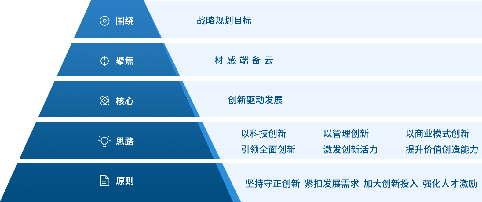强化“材-感-端-备-云”业务与现代信息技术深度融合,构建结构合理、先进管用、开放兼容、自主可控、具有竞争力的集团现代产业技术体系。